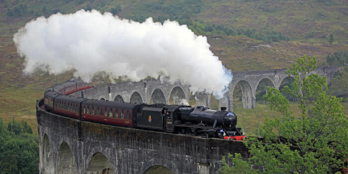 Конечно, внимательный зритель не мог остаться равнодушным от сцен фильма, где дети едут в школу на поезде. Этот путь называется — является West Highland Line и находится он в Шотландии, как и описывала автор книг. Знаменитая сцена второго фильма, где Гарри и его друг Рон Уизли опоздали на поезд ин е смогли попасть на платформу, были вынуждены догонять поезде на отцовской машине. И это место даже частично не компьютерная графика, весь маршрут полностью реален. Поезд провозит пассажиров от порта Маллая до города Форт-Уильям, а его маршрут проходит через захватывающие пейзажи шотландские горы с чудесными пейзажами. Тот самый захватывающий дух мост это виадук Гленфиннан, расположенный в горной местности Хайленд.