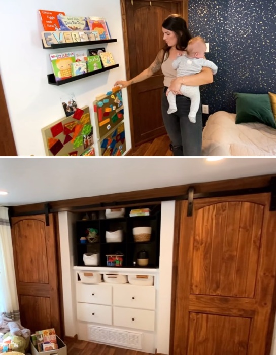 Игрушки и вещи малышей и их родителей есть где хранить.