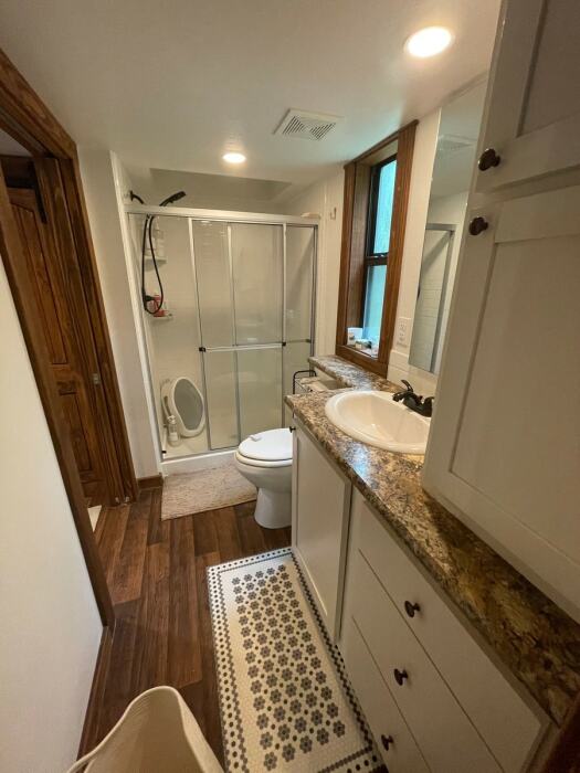 Оставшееся пространство нижнего уровня занимает полностью функциональный лестничный пролет, мини-прачечная и благоустроенная ванная комната, размерам и оформлению которой позавидуют даже владельцы малогабаритных квартир. Просторная душевая кабина вовсю высоту потолков, смывной унитаз, вместительная тумба со встроенной раковиной, навесные шкафы, включая шкаф-зеркало, наличие открывающего окна и места для передвижения – всего этого вполне достаточно, чтобы семья из 4-х человек не чувствовала дискомфорта в быту.