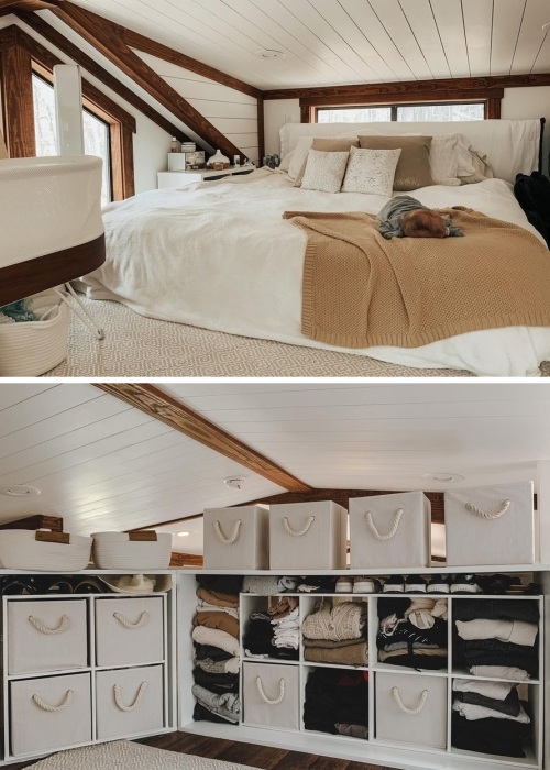 Осталось заглянуть в спальню родителей, которая занимает весь лофтовый уровень. Довольно просторная комната с окнами с трех сторон кажется намного объемней, нежели является на самом деле. Проблемой стало лишь то, что супругам приходится передвигаться на коленях, следуя до своей кровати максимально большого размера, чтобы можно было полноценно отдохнуть и расслабиться. Ханне же требуется гораздо больше передвижений, поскольку здесь хранятся все ее вещи и большая часть детских, которые нужно разложить по полочкам или сложить в оригинальные корзинки/органайзеры. Для гардеробной супруг изготовил довольно вместительные стеллажи, открытые комоды и полки, чтобы не устраивать беспорядок, ведь вещей у семьи много, хотя и большую часть они отдали при переезде, а также отдают нуждающимся сейчас, по мере того, как младший сын вырастает из них или они для себя покупают новые.