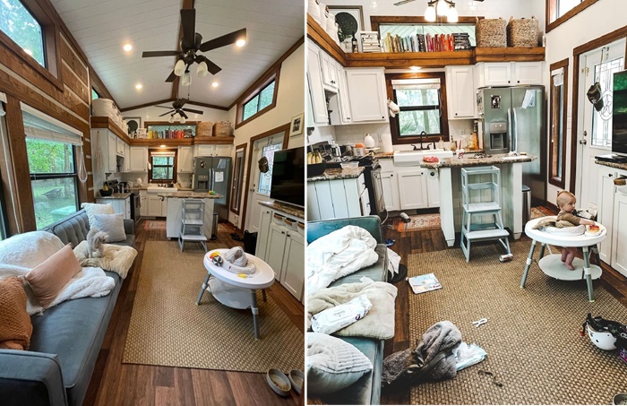 Да, им пришлось немало потрудиться, чтобы обновить интерьер и спланировать свое семейное гнездышко, ведь к тому времени у них уже родился старший сынишка и нужно было более чем рационально распределять жилые зоны. Учитывая, что изначально парковая модель строилась по всем правилам устойчивого дизайна, переделывать ничего не пришлось, лишь обновить краску и подыскать необходимую мебель, сантехнику и бытовую технику. Поскольку семья планировала жить в крошечном доме на постоянной основе, к выбору моделей техники мебели подошли основательно. Учитывая отдаленность дома от населенных пунктов и отсутствия соседей, их растущей семье требовался холодильник типа Side-by-Side, вместительные шкафы и тумбы для хранения, открытые полки, а также большой раскладывающийся диван, который пришлось делать на заказ.