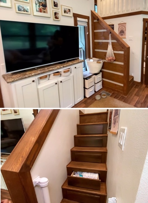 За ней следует гостиная с длинным диваном-трансформером, который превращается в удобную кровать. Это очень удобно, когда в семье малыш, а маме просто некогда подниматься на второй уровень, чтобы покормить и уложить спать ребенка. В нем, как и в любом предмете мебели или ступенях, предусмотрены системы хранения, чтобы вместить в небольшой дом кучу вещей (включая сезонные), массу уходовых средств, а также инструменты, гаджеты и всякие нужные в обслуживании дома и быта мелочей. Напротив дивана супруг самостоятельно встроил комод с полками, заказав лишь дверцы и столешницу по размеру. На нем установлена ТВ-панель с огромной, как для крошечного пространства диагональю, но семья захотела иметь собственный кинотеатр, где можно было проводить приятно время в кругу семьи.
