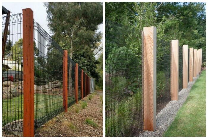 Есть огромное множество способов декорирования и маскировки этих самых деревянных реек. Наиболее элегантные и функциональные, или наоборот показывающие всю мощь конструкции. С помощью них можно даже увеличить высоту забора. Уже само использование деревянных столбов заместо столбов из металла тут же изменяет восприятие. Горизонтальные или вертикальные планки вдоль верхней или нижней, а можно и с двух сторон, сетки тут уже создадут четкие границы и завершенность самой большой конструкции.