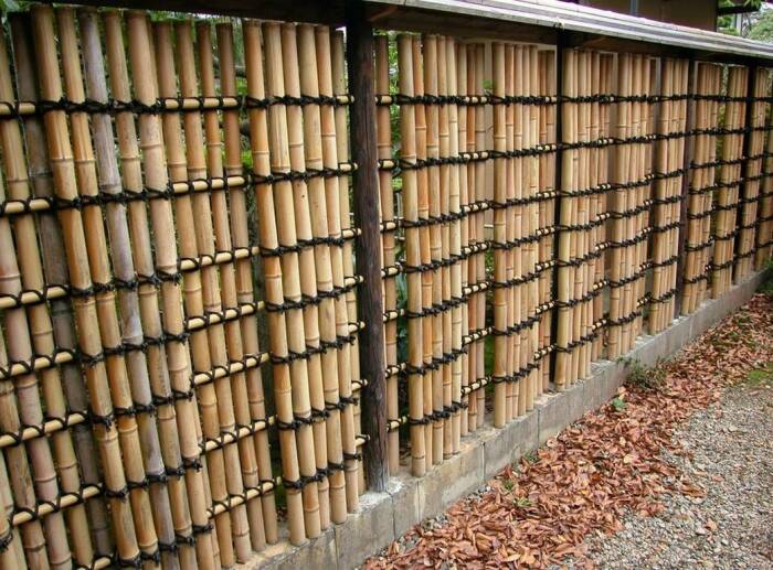 Когда не хочется ничего перекрывать, то для добавления уюта и естественности можно использовать плетения из лозы или веточек. Красиво, экологично, эстетично. Подобного рода плетение тоже должно быть выдержано в стиле, либо как горизонтальном, либо вертикальном направлении, это может создать своего рода естественные узоры. Тип веточек зависит от того, какие вообще имеются, подойдут как ивовые, так и любые другие. Альтернативный вариант уже включает использование тростника, либо бамбука. Тростник не редкость, а вполне доступный материл, хоть он и может намокать под дождём и терять свой внешний вид. Он всё равно является очень интересным решение, хотя даже бамбуку будет уступать в долговечности и прочности. Из него можно сделать на заборе очень красивую бамбуковую ширму. Кончено, стоимость бамбука достаточна высока, и учитывая длину забора может стоить дорого, но если это не препятствие, то самый красивый забор в округе обеспечен.