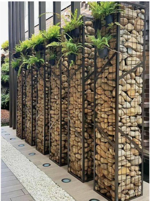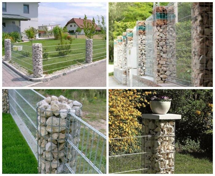 Габионы представляют из себя некие конструкции, из таких же металлических сеток, но уже заполненные камнями, галькой, чем угодно. Имеют также разнообразные формы и высоту и толщину. Они не просто становятся заборами, но и подходят для того, чтобы облагородить простые заборы из сетки, добавляют в ландшафт структуру, объемы. Их не обязательно делать на всю высоту, достаточно, для укрепления забора, расположить камни в нижней части, что сразу же увеличит его прочность и устойчивость. Также это поможет защитить участок от мелких животных, которые вредят саду или огороду. А ещё они значительно снижают уровень шума, если участок находится у проезжей дороги.
