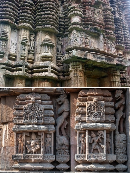 Структурные особенности: Храмовый комплекс, построенный из песчаника и латерита, состоит из четырех основных частей (залов): Вимана, Джагамохана, Ната Мандира и Бхога Мандапа. Все они выстроены в одном направлении и постепенно увеличиваются в размерах от Бхога Мандапы до Виманы (преимущественно в высоту). В общем же каждое из 150 строений славится своими замысловатыми скульптурами и резными изображениями богов, богинь и других мифических существ, в обликах которых мастерски прорисована каждая черта, придавая реалистичности образам. • Вимана является главным святилищем с башней высотой 55 метров, причудливые стены которой сверху донизу покрыты замысловатыми узорами, а вершина напоминает улей (имеет название «Амалака»). Ее украшают голова льва и лотосы, которых можно увидеть внизу. • Джагамохана – зал собраний с двумя воротами, выходящими на север и на юг, которые украшают перфорированные окна с изображениями львов на задних лапах. Это прямоугольное здание с пирамидальной крышей, поддерживаемой четырьмя колоннами, на стенах которого вырезаны боги и мифические существа.