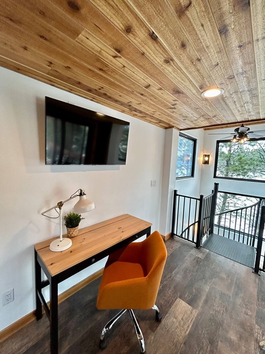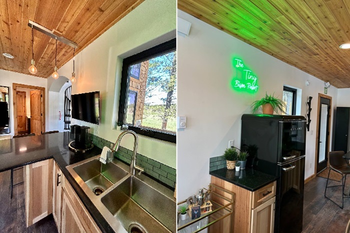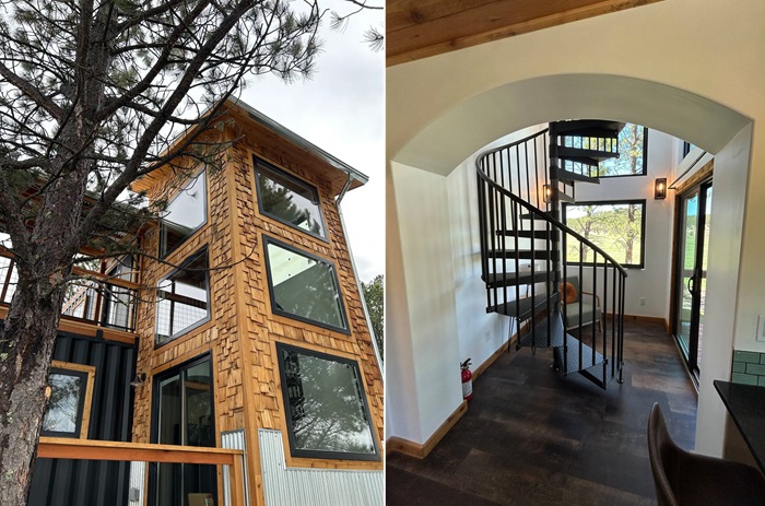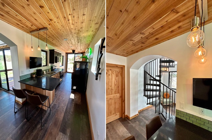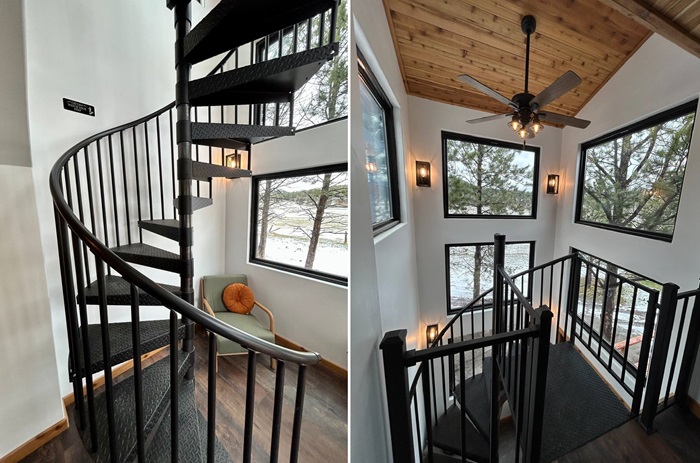 Одним из самых гениальных внедрений проекта, получившего название The Tiny Bison Resort, является крытая внешняя лестница, которая стала отдельной пристройкой с оригинальным фасадом. Действительно, размещение лестницы за пределами крошечного дома не только экономит внутреннее пространство, но и добавляет эффектный элемент в общую эстетику объекта.