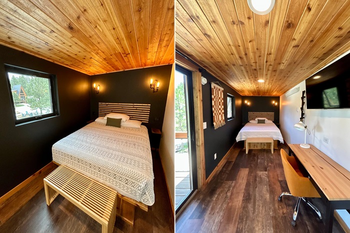Поднявшись на второй уровень, где крытая терраса имеет такую же площадь, как и жилое пространство, гости попадают во второй контейнер, превращенный в просторную спальню. Сразу у входа предусмотрено место для работы, которое можно использовать и как бьюти-зону, если гости приехали полностью расслабиться и перезарядиться. При оформлении спальни использовали натуральное дерево и современные элементы, что в тандеме создает теплую и изысканную атмосферу, настраивающую на идеальный уединенный отдых.