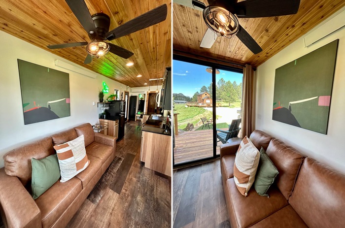 Интерьер контейнерного дома не менее продуман, внутри каждой зоны можно заметить уютные деревенские нотки, идеально сбалансированные с современной техникой и мебелью. Деревянные потолки и темные стены создают теплую, расслабляющую атмосферу. Учитывая, что большие окна и стеклянные двери расположены стратегически грамотно, естественный свет наполняет интерьеры каждого сектора, увеличивая объем помещений, обеспечивая при этом связь с внешним миром. Такой дизайн является идеальным выбором для тех, кто ценит спокойствие природы, наслаждаясь современными удобствами.