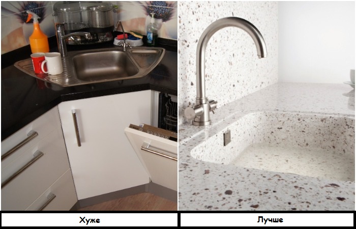 Второй, немаловажный момент – комфорт в быту, который во многом зависит именно от мойки и крана. Практичность, простота в уходе, надежность, долговечность, износостойкость, не слишком шумная поверхность – все это имеет первостепенное значение. Также обратите внимание, можно ли встроить в раковину дозатор для моющего средства и вывести кран с фильтрованной водой. Даже если у вас нет средств на дорогую литую раковину из камня, и вы склоняетесь к выбору классической нержавейки, покупайте более качественную модель. Что касается смесителя, то им мы пользуемся постоянно. Соответственно, активная эксплуатация приводит к быстрому износу и амортизации. И если сэкономить на кране, его в любой момент может сорвать, и тогда «привет, потоп». Лучший материал для подобных изделий – это латунь с никелевым или хромированным покрытием, так как она наиболее долговечна. Также не забывайте своевременно менять прокладки, чтобы избежать протечек.