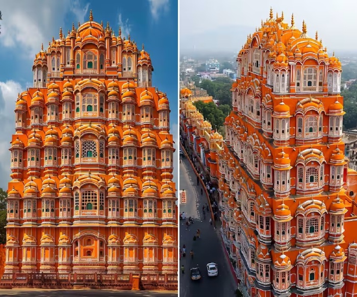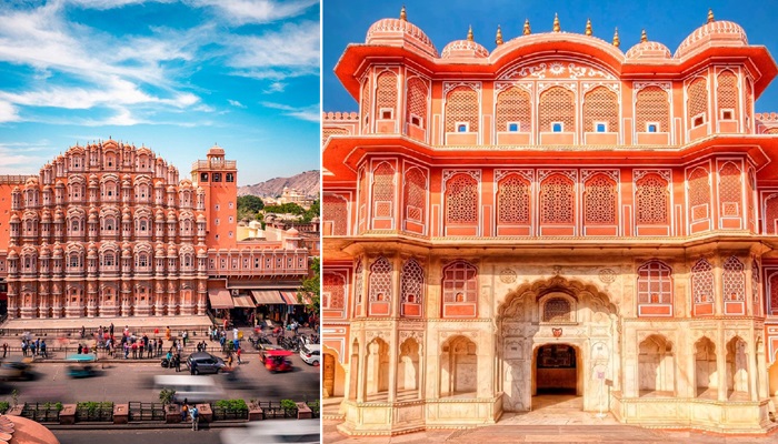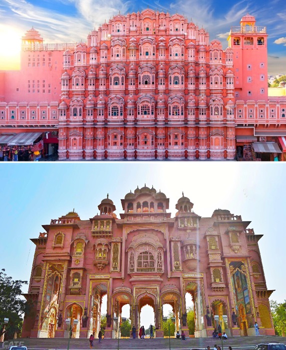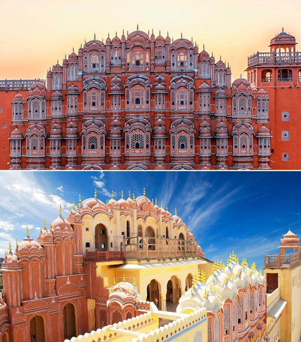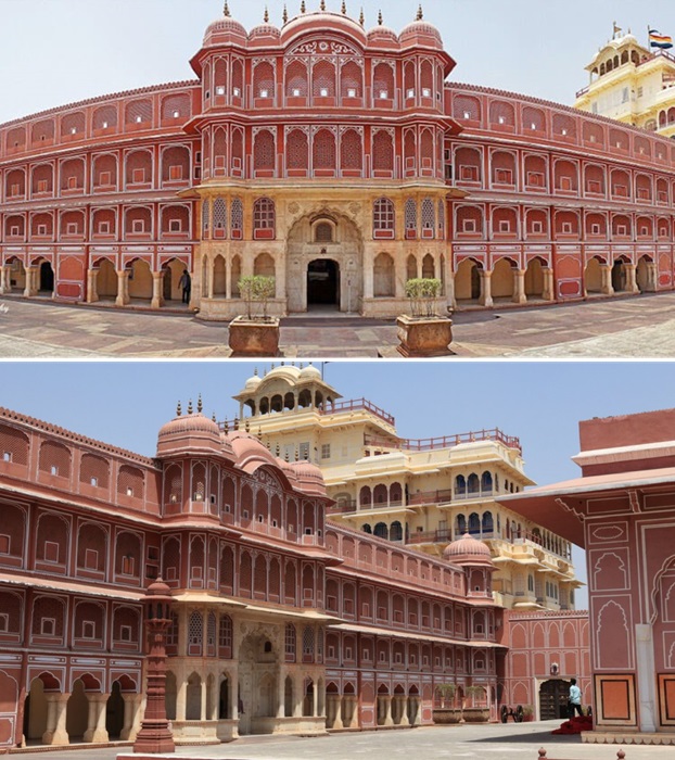 Расположенный в самом сердце Джайпура, «Дворец ветров» (Hawa Mahal) является одним из самых знаковых и узнаваемых архитектурных ансамблей города. Построенный в 1799 году по приказу махараджа Савая Пратапа Сингха, он отличается впечатляющим пятиэтажным фасад, украшенным 953 выступающими эркерами, называемыми джхарокхами. Разделенные на маленькие ячейки и прикрытые вычурными орнаментами, они служили наблюдательным пунктом для женщин королевской семьи, которые могли подглядывать за городской жизнью, при этом оставаясь незамеченными. Помимо этого решетчатые отверстия обеспечивали циркуляцию воздуха, создавая освежающую атмосферу, которой так не хватало в жарком климате Раджастхана. • «Городской дворец»