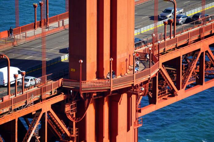 Мост Золотые Ворота - признанное во всём мире инженерное чудо не только из-за размеров, но и практически бесконечного количества деталей. Одна из любопытных характеристик - это количество креплений, которым обладает мост. Он насчитывает около шестисот тысяч болтов на каждой башне. Он, а также специальные заклепки использовались при соединении разных других элементов и оказывают особое влияние на его долговечность. При более точном подсчёте становится ясно, что только в опорных башнях общее количество этих болтов превышает более миллиона, а в целом по всему мосту и более трёх. Общая цифра и правда впечатляет, но вполне логична и реальна для столь большой конструкции, для её прочности и устойчивости.
