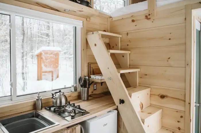 Здесь также имеется оборудованный кухонный уголок, так что гости смогут насладиться домашней пищей не покидая лесное убежище, если заранее позаботятся о стратегических запасах, конечно же. Газовая плита, мойка, несколько открытых полок с набором посуды, мелкой бытовой техники и обеденных приборов, холодильник, проточная холодная и горячая вода – всего этого вполне достаточно, чтобы вдохновить на кулинарные эксперименты.