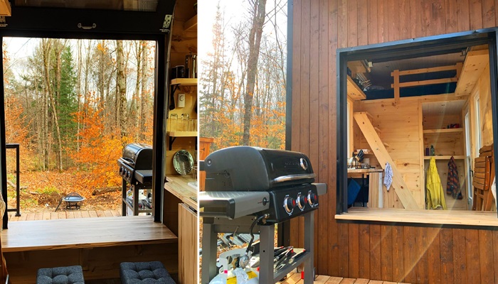 Готовый к проживанию гостиничный номер после доставки был установлен стационарно возле дощатой террасы так, чтобы не образовывалось ступеней непосредственно у входа. Это пространство служит местом отдыха на свежем воздухе, когда снег или дождь не дает обосноваться на ближайшей поляне. На террасе установлен стол для пикника и гриль-барбекю на колесах, который можно передвинуть под навес, если пойдет дождь или снег. Поскольку речь зашла о зонах отдыха на свежем воздухе, то возле каждого лесного убежища предусмотрена костровая яма, которая соответствует всем нормам противопожарной безопасности. При этом гостям категорически запрещается разводить открытый огонь в любом другом месте.