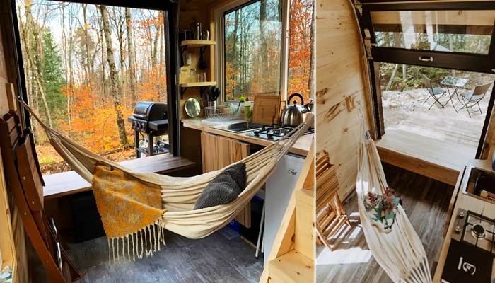 Учитывая крошечные габариты очаровательного номера, неудивительно, что основное его пространство имеет открытую планировку и каждая зона выполняет несколько функций. Когда гости отобедали или просто захотели отдохнуть кухня-столовая запросто может стать гостиной. Нужно лишь закрепить одну сторону гамака на противоположной стене и, покачиваясь расслабляться, наблюдая за тем, что происходит за окном, занимающим практически весь торец «Шалфейного домика».