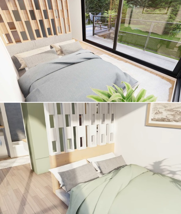 Второй контейнер отдан под обустройство уютной спальни и роскошной ванной комнаты, где даже самая маленькая деталь продумана до мелочей. Попасть на второй этаж получится лишь по наружной лестнице, что не всегда будет удобно, но по-другому сохранить объем контейнеров никак нельзя. Если этот проект реализовать в теплом регионе или использовать домик в качестве летней дачи, то это обстоятельство никак не повлияет на комфортное проживание. Тем более, что спальня порадует простором, большой двуспальной кроватью и щедрым остеклением, дающим возможность наслаждаться красотой окружающего пейзажа, не вставая с постели.