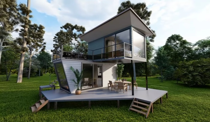 Срезанный под углом торец и щедрое остекление сделает летний домик более светлым и объемным. | Фото: newtrendhouses.com.