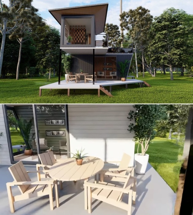В этом проекте разработчики предлагают использовать довольно просторную террасу, которая некоторым образом в хорошую погоду поможет расширить жилые зоны, поскольку лаундж-зону и летнюю столовую можно запросто вынести на улицу. А вот зрительному увеличению пространства поспособствуют окна, двери и даже торцевые стены, изготовленные из стекла. Интересным стало и то, что один торец нижнего контейнера был срезан под углом 45 градусом и полностью остеклен, сохранив при этом полную длину потолочной части.