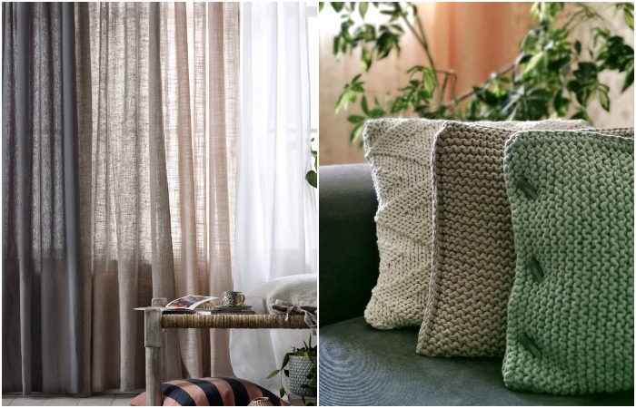 При выборе изделий ориентируйтесь не столько на цвет или фасон, сколько на материал – никакой дешевой синтетики с блестками и яркой фотопечатью. Отдавайте предпочтение натуральным тканям – это может быть лен, хлопок и пр. Важен и дизайн – делайте ставку на сложные оттенки и оригинальные фактуры. Боле выигрышно смотрится однотонный текстиль, но если душа тянется к принтам, то они не должны быть слишком броскими и аляповатыми.