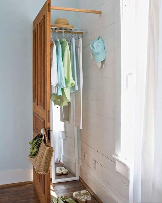 Зачастую прихожая это то место, в котором скапливается в разных местах множество аксессуаров. Однако, как первое что видят гости, приходя в дом это именно она. Потому так важно правильно распределять вещи в этой зоне. Старая дверь также может стать очень универсальным местом для хранения разных мелочей или вещей. К двери можно добавить выдвижные ящики, тем самым превратив её в своеобразный комод. Либо, несколько разных крючков, на которые можно будет вешать шапки или шарфы, создав вертикальную систему хранения. Для этого дверь можно как крепить к стене, так и оставить на полу, разместить её горизонтально, либо вертикально. Беспорядок будет устранён.
