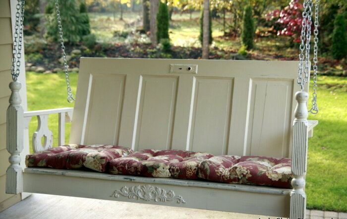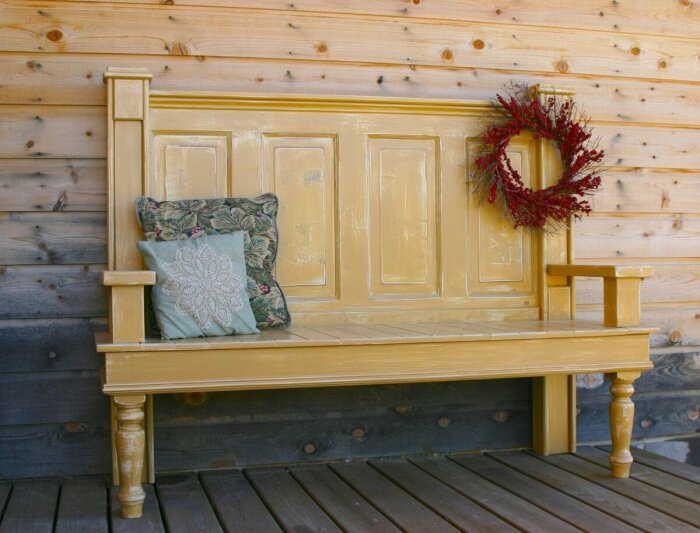 Для того, чтобы не было заноз и сидеть было комфортно дверь важно хорошо отшлифовать. покрыть её краской или лаком, ведь при нахождении такой скамейки на улице срок службы её значительно сокращается. Отдельно можно создать и сидение, использовав саму дверь как надёжный каркас. Положить поролон, либо специальные сидушки, они продаются в магазинах, уже после его хорошо бы обтянуть тканью, чтобы также продлить срок службы мягкой части скамейки. Для закрепления и обивки и ткани можно использовать специальный клей, либо степлер, это просто и быстро. Создастся красивый и максимально аккуратный вид, никто не скажется, что это старая дверь.