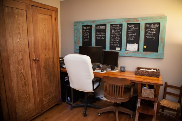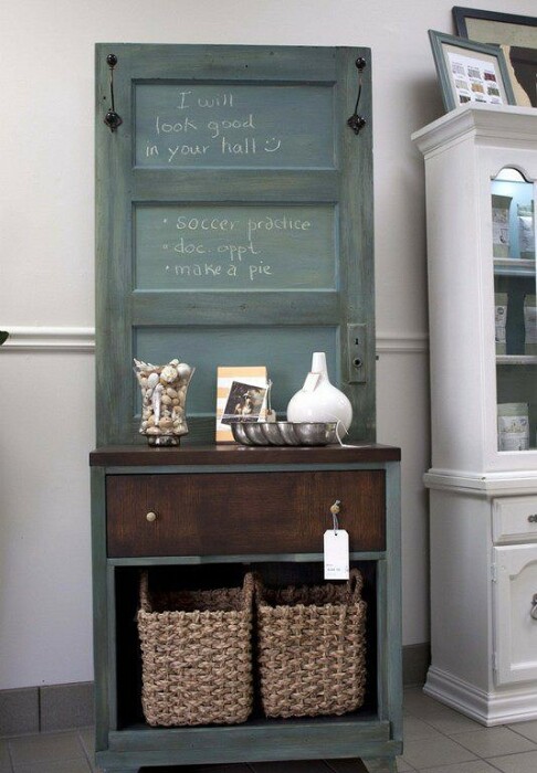 Доска для записи висящая перед столом это очень полезная штука. И старая дверь отлично выполнит эту функцию, но, её нужно немного доработать. Важно хорошо подготовить поверхность будущей доски, обязательно хорошо почистить её, отшлифовать. Можно вставить специальные панели, на которых будут надписи, либо, покрыть одну или несколько частей доски специальной краской для мелка или грифельной краской. Дверь можно разделить на несколько секций горизонтально повесив её, либо сделать одну большую поверхность. На ней можно будет делать заметки по работе либо оставлять забавные сообщения для всей семьи. Также можно крепить на магниты фотографии, чеки, или просто милые воспоминания.