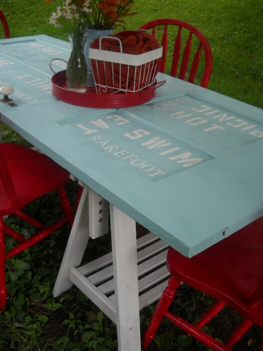 Старая дверь как ничто другое идеально подходит для создания большого стола для обеда всей семьи. Хотя, стол не обязательно должен быть обеденным, за ним можно работать, сделать его декоративным или просто приделать новую столешницу к журнальному столику в гостиной. Её обязательно нужно покрасить лаком и отшлифовать, чтобы поверхность была защищена, если на неё поставят что-то горячая и была ровной. Для красоты есть вариант добавить разные забавные надписи. Для создания ножек подойдут деревянные или металлические материалы, либо просто ножки от старых табуретов.