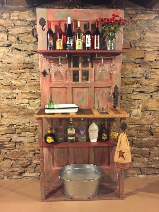 Когда дома имеется старая дверь, она также может стать мини-баром. Каким же образом? Дверь необходимо плотно и прочно установить на консоли, либо приделать к ней небольшие ножки. Полки и ящики также прикрепить отдельно, но прочно. На них отлично будут смотреться разноцветные бутылки, бокалы, а также чашки или стаканы. Как и любой бар его можно украсить светильниками, добавить зеркало по задней стенке. Дверь может быть как вынесена на свежий воздух, так и найти себе место в углу в загородном доме.