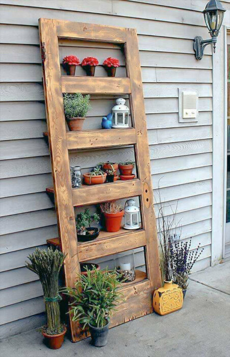 Стеллаж может быть сделан и для цветов, чтобы красиво расставить их и создать целую вертикальную клумбу прямо в доме. Дверь можно установить вертикально, классически, либо креативно — наклонно, прикрепить ящики или полочки, надежные, чтобы выдержали вес горшков. Сделать это можно в хаотичном порядке, на разном расстоянии друг от друга. Растениям точно понравится такой подход.
