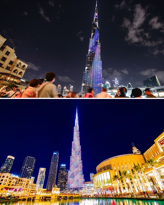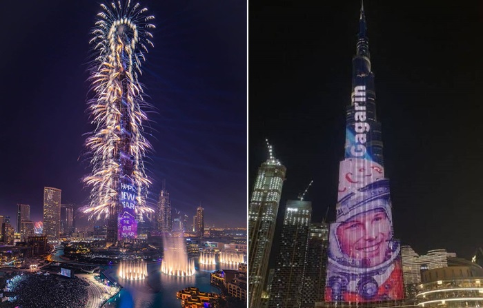 Самое высокое здание в мире – Башня Бурдж-Халифа (Burj Khalifa), конечно же, также не разочаровывает, когда дело доходит до празднований с использованием световых шоу. Игольчатый небоскреб Дубая, взлетевший ввысь на рекордные 828 метров, становится главной сценой, где разыгрываются самые незабываемые зрелища, главными действующими «лицами» которых становятся светодиодные огни. С их помощью и создаются потрясающие воображение анимации, превратившиеся в настоящие произведения искусства, которыми умело руководят не столько художники, сколько инженеры и программисты. Ошеломляющие 27 километров мерцающих нитей огней вживлены в медиафасад небоскреба так, чтобы в любое время можно было создать умопомрачительные световые эффекты.