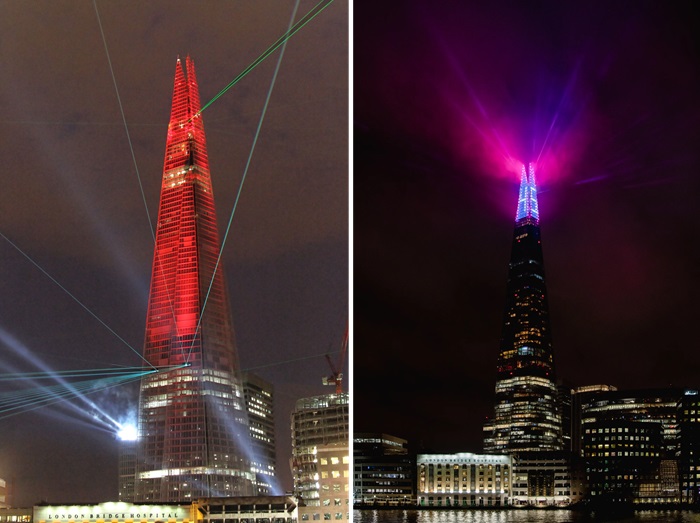 Световым шоу небоскреба The Shard можно любоваться со всех смотровых площадок Лондона.