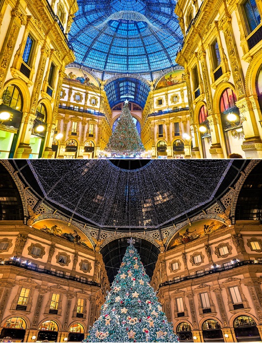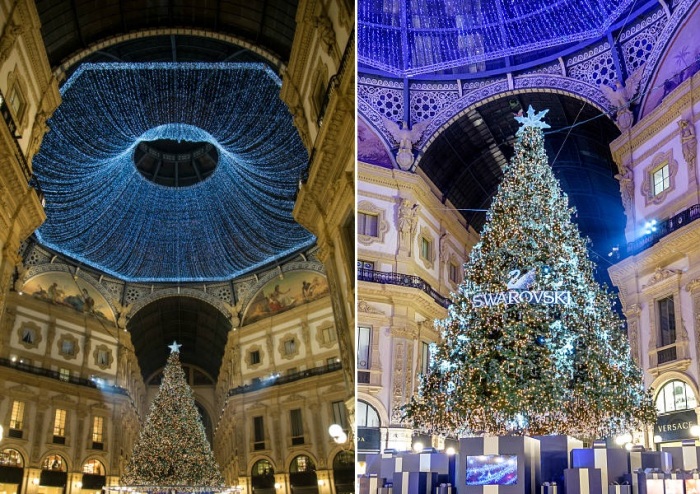 В Милане, считающемся законодателем моды, элегантная торговая галерея, названная в честь первого короля объединенной Италии – Витторио Эммануэле II, в преддверии Рождества всегда преображается. Построенная по проекту Джузеппе Менгони (обошедшего сразу 176 архитекторов, участвовавших в конкурсе на лучший дизайн галереи), она стала домом моды для самых известных мировых брендов (Prada, Gucci, Louis Vuitton и др.) и фешенебельных ресторанов, что наложило отпечаток не только на оформление интерьеров, но и на освещение. В праздничные дни иллюминация всегда подчинена изысканной тематике, что в тандеме с роскошной рождественской елкой, установленной в центре и украшенной кристаллами Swarovski со сверкающими огнями, превращает Галерею Витторио Эммануила II (Galleria Vittorio Emanuele II) в главный центр притяжения.