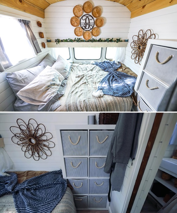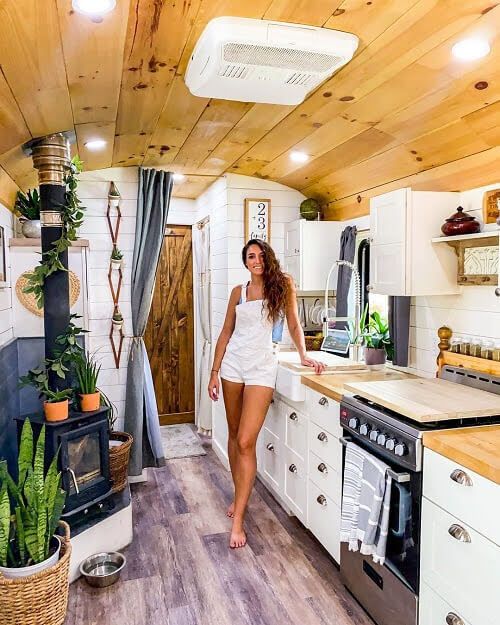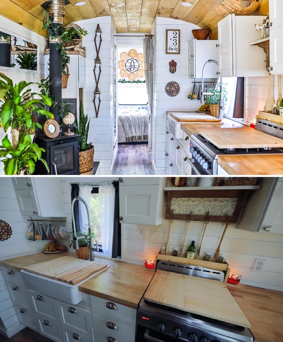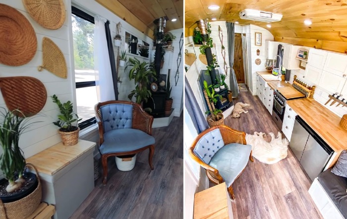 Пространство напротив кухни чаще всего остается свободным, но его можно использовать в качестве обеденной зоны или домашнего офиса. Открытое пространство, декоративные плетеные изделия, закрепленные на свободной стене, чугунная дровяная печь, наполняющая жилое пространство теплом – все это делает автобус более похожим на настоящий дом.