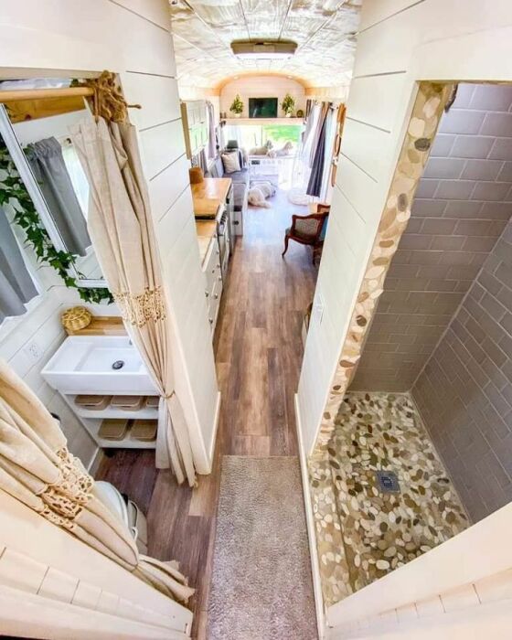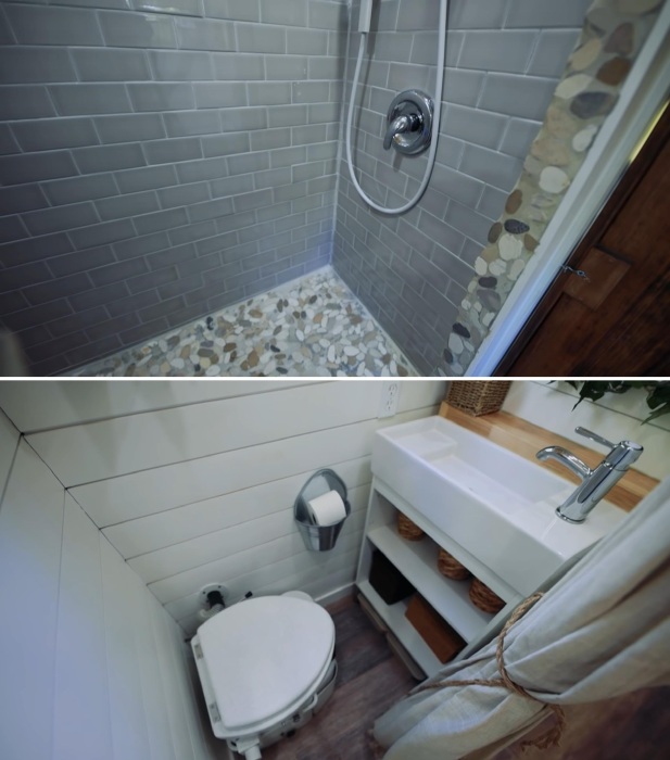 Учитывая, что молодые люди планировали жить в автобусе на постоянной основе и в любое время года, неудивительно, что под организацию благоустроенной ванной комнаты выделили достаточно места. Чтобы свободно двигаться, а не ютиться в тесном уголке, ее разделили на две части. Проход же между ними является коридором, ведущим в спальню. С одной стороны обустроили душевую, две стены которой облицевали керамической плиткой, а вместо двери используется водоотталкивающая шторка. Напротив находится туалетный столик со встроенной раковиной, тумбой и компостным туалетом. В этой части имеется еще и открывающееся окно, что позволяет быстро избавиться от пара во время приема душа.
