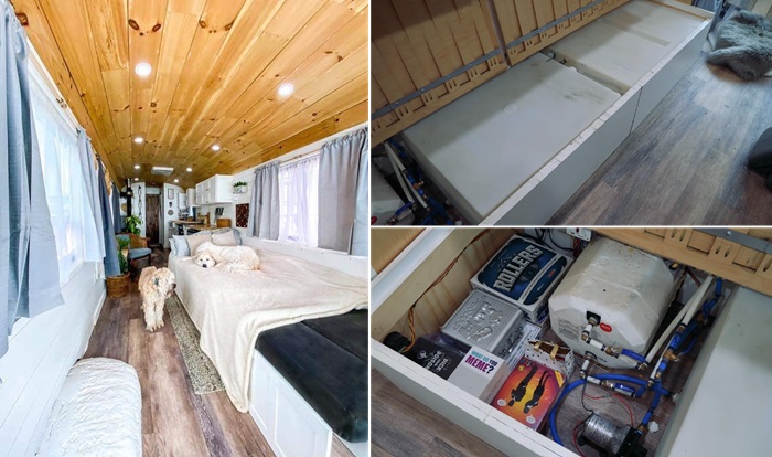 Больше бутафорская гостиная, ставшая излюбленным местом отдыха трех больших псов – любимцев пары, плавно переходит в настоящую лаундж-зону, где можно расслабиться на полноразмерном диване, посмотреть телевизор или почитать в элегантном кресле, которое кочует из одной части дома в другую. Обилие белого цвета, высокие потолки и щедрое остекление (в этой зоне сохранилась значительная часть окон) сделали гостиную просторной и довольно уютной, что способствует размеренному отдыху и приятному общению. Несмотря на умиротворяющую обстановку, эта часть автобуса выполняет очень важные функции. Мало того, что изготовленный самостоятельно диван имеет внушительные размеры, он легко обеспечивает дополнительным спальным местом и является бытовкой, поскольку в ящике под мягкими подушками спрятаны водонагреватель и 300-литровые емкости с питьевой водой, что немаловажно для автономного дома, предназначенного для круглогодичного проживания.