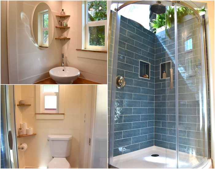 Благоустроенная и вполне современная ванная комната в модели Oasis Tiny Home.