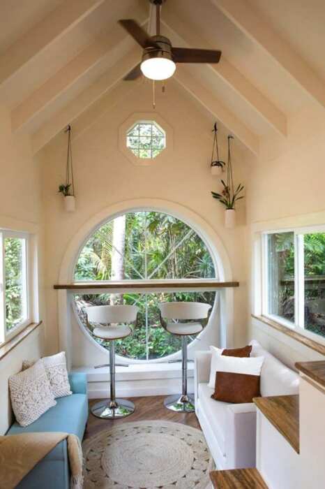 Подоконник посреди круглого окна выступает в роли барной стойки. | Фото: findtinyhouse.com.