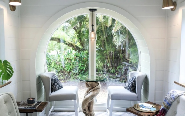 Гостиная с двумя диванчиками с трех сторон окружена большими окнами, впускающими очень много света, что делает ее самой объемной и воздушной зоной гавайского убежища.