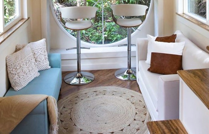 Уютная гостиная в гавайском крошечном доме Oasis. | Фото: tinyhouseuniverse.com.