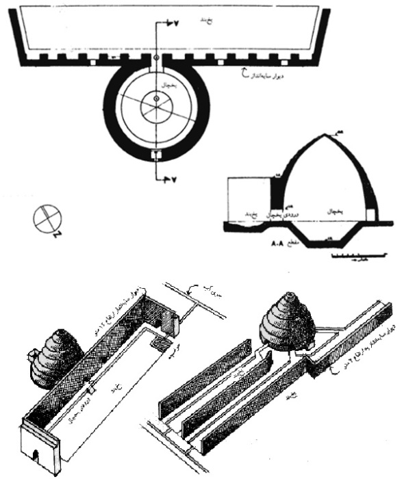 Главной же хитростью персов являлся состав раствора, которым покрывали внешнюю часть куполообразной или конической структуры, создавая водонепроницаемую оболочку, попутно обладающую высокими теплоизоляционными свойствами (использовал:глину, мелкий песок, золу, желтки, шерсть животных, известь и секретные ингредиенты). Интересным является и неожиданное расположение дверей, которых в наземной части две – одна выходит на север, вторая на юг. Причем той, что расположена на северной стороне всегда пользовались только зимой, а южной – летом. Правда, при строительстве крупных «ледяных домов», которые возводились для общественных нужд или для продажи, с южной стороны (ориентация восток-запад) строили высокие стены, дающие тень в самую жаркую пору. При этом они должны были спасать от прямых солнечных лучей не саму дверь, а драгоценную ношу в руках людей, чтобы лед не успевал таять, когда его перемещают в обеденное время.