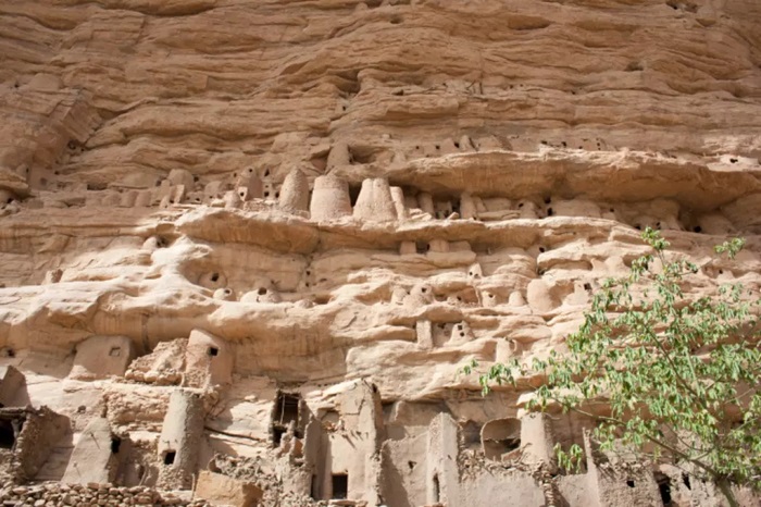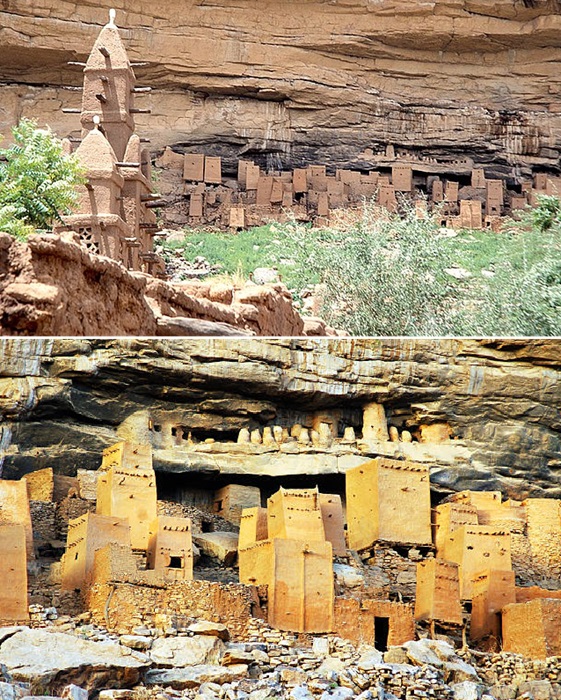 С древности люди обживали скалы, точнее сказать, пещеры, постепенно расширяя их или пристраивая надежные убежища, спасающие не только от непогоды или диких зверей. На протяжении всей истории человечества захватнические войны не раз вынуждали племена использовать более древние убежища для спасения своих семей, скота и даже веры. Не стало исключением и племя догонов, поселившееся в X-XII вв. в горном массиве Бандиагара (Мали).