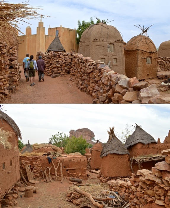 В каждой деревне всегда было скрытое от глаз зернохранилище, точнее сказать два, – мужское и женское. Как правило, они были спрятаны в самых отдаленных и неприступных углублениях скалы, куда можно добраться только по извилистой тропе деревянных лестниц, которые нужно не только обнаружить, но и изловчиться немыслимым образом, чтобы пройти по ним. Есть поселения (Тели, Ирели и Тирели), где глиняные зернохранилища идеально вписываются в скалистый ландшафт, не привлекая к себе внимание. К ним подняться не менее проблематично, а порой неподготовленным искателям приключений и чужого продовольствия и вовсе невозможно, поскольку придется спускаться просто по веревке, спущенной в пугающую пустоту с вершины плато или быть настоящим акробатом-скалолазом, способным преодолеть вертикальную плоскость без оснащения. Если же стратегически важные объекты строились в пределах неприступной деревни, то также возводились из глины, только имели куполообразную коническую форму.