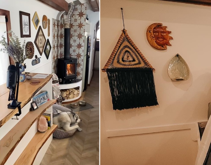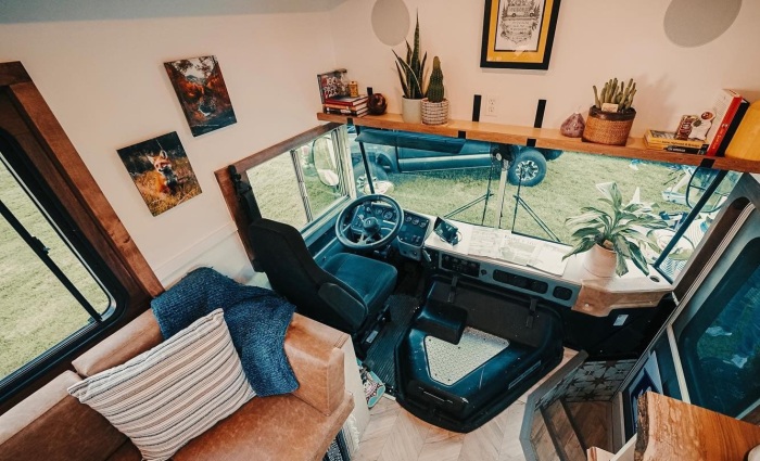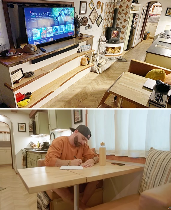 Благодаря изысканиям в области дизайна у бизнес-консультанта, по роду профессии далекого от оформления интерьеров, теперь есть прекрасное убежище, в котором он живет, работает и заодно путешествует вместе со своим любимым псом Скаем. Несмотря на то, что Джонатан один ведет кочевой образ жизни, в его доме есть все для встречи гостей. Чтобы жилище было полноценным, энтузиаст позаботился о благоустройстве и приятной обстановке. В гостиной, например, у него установлен диван-трансформер, который может превращаться не только в двуспальную кровать, но и стать прекрасным обеденный уголком, где можно устроить посиделки с друзьями или родственниками. Гостиная находится сразу за водительским креслом, здесь увлеченный энтузиаст установил необычно длинный стеллаж, полки которого изготовил из досок, сохранивших природные формы, цвет и фактуру. Он стал и книжными полками, и выставочной витриной, и подставкой под внушительную ТВ-панель.