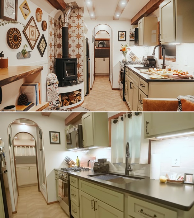 Джонатан не отказал себе в удовольствии обзавестись прекрасно оборудованной кухней, ни в чем не уступающей тем, которые можно увидеть в традиционном доме. Любитель путешествий и домашних блюд задействовал пространство от пола до потолка, чтобы поместилась полноразмерная бытовая техника, включая четырехконфорочную газовую плиту с духовым шкафом, двухкамерный холодильник, а также необходимое оборудование и вместительные тумбы со шкафами. Главной же гордостью счастливого домовладельца является великолепный кирпичный фартук, оформленный в виде марокканской плитки зулляйдж, которая выгодно оттеняет гладкие черные столешницы.