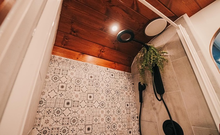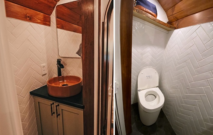 Оптимизируя пространство, молодой человек не нашел ничего лучшего, как разделить ванную комнату. Он разместил туалет и раковину на одной стороне коридора, а душ — на противоположной. Такая планировка не только позволила эффективно скрыть арки для колес, но и предлагает дополнительные удобства для гостей. Благодаря такому расположению Джонатан может с комфортом принимать душ, не мешая гостям пользоваться туалетом и раковиной (и наоборот). При оформлении туалета и душевой использовали керамическую плитку и натуральное дерево.