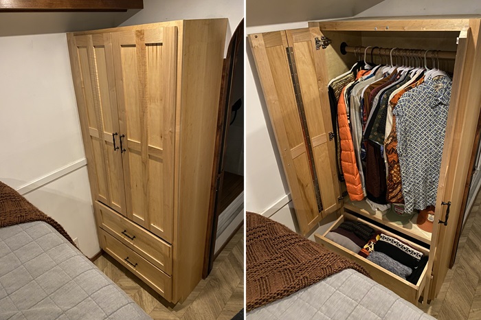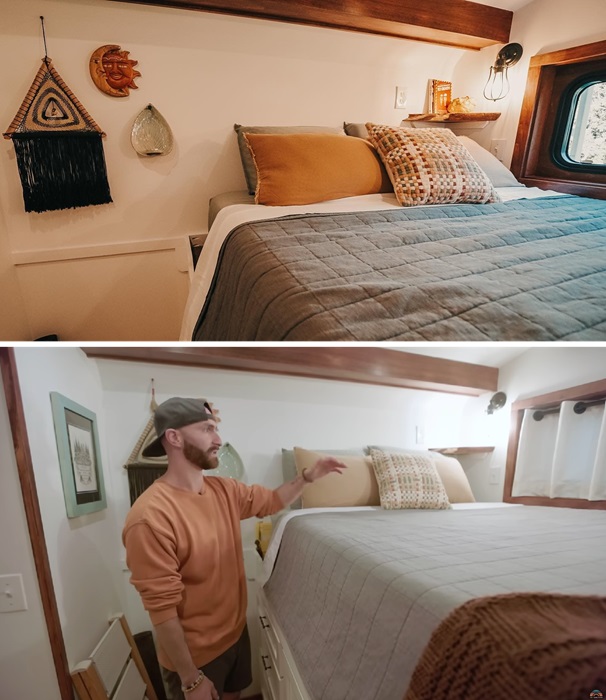 Спальня также была искусно спроектирована, что позволило максимально использовать пространство, не нарушая расслабляющую обстановку, которая необходима для полноценного сна. Оформленная в стиле лофт, она предусматривает высокий подиум, ставший вместительным хранилищем с выдвижными ящиками и полками для обуви. Половину этого пространства занимает емкость на 380 литров питьевой воды, оборудование для поддержания работы системы «теплый пол». Там же находятся два сноуборда, дополнительный корм для собак и все остальное, что нужно спрятать с глаз долой. Практичным бонусом стал доступ со стороны багажника, что очень удобно для крошечного дома.