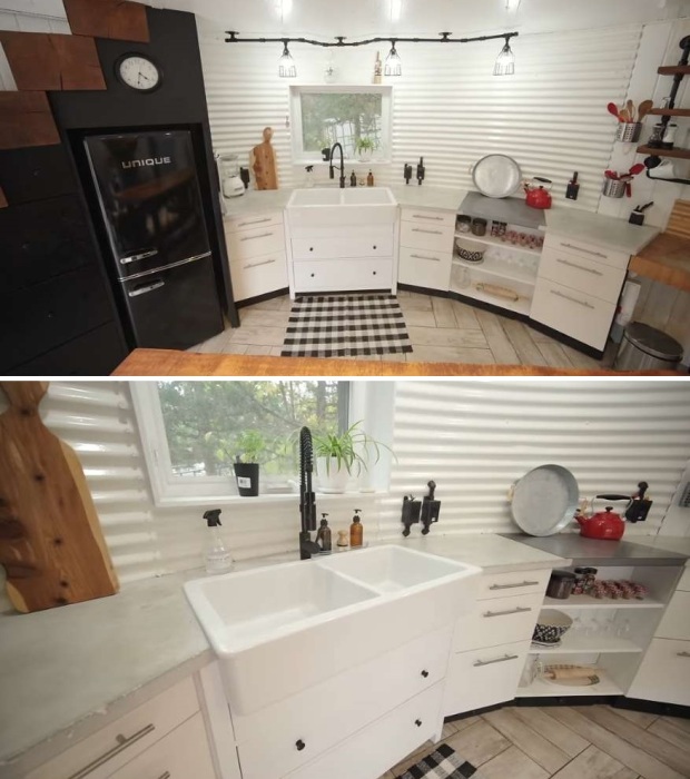 Интересное решение: Главной проблемой при обустройстве жилища стали круглые стены, которые требовали особого подхода. Если гостиную можно было организовать в центре нижнего уровня, то кухня требовала более тщательного подбора мебели. Учитывая, что стандартные столешницы имеют прямоугольную форму, предприимчивые Пэм и Дэвид купили готовые модульные тумбы, установили их с определенным отступами друг от друга и от стены, а затем сделали конструкцию из дерева, которая помогла залить бетонную рабочую поверхность.