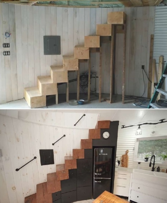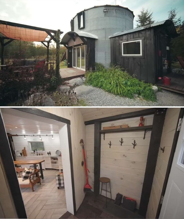 После того как башня обрела свои формы, были вырезаны окна и двери, затем укрепили ее структуру с помощью деревянных брусьев, а пространство образовавшихся ячеек заполнили напыляемой полиуретановой пеной, которая сделала структуру монолитной, крепкой и очень теплой. Благодаря этому стальная оболочка превратилась в жесткую самонесущую конструкцию, способную удержать перекрытие без установки дополнительных опор. Также пристроили стандартное помещение, которое стало прихожей и своеобразной буферной зоной, чтобы предотвратить проникновение холодного воздуха при открывании входной двери. Она помогает пристроить верхнюю одежду и сезонную обувь, при этом выделили местечка для скамейки, которую пара сделала своими руками, как и вешалку, и скрытые системы хранения, и многое другое в этом удивительном доме.