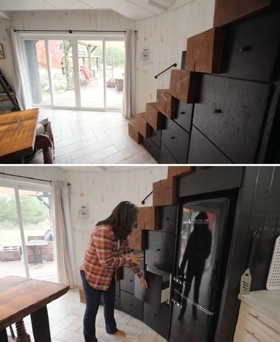 Подобным образом они поступили и с изготовлением структуры лестницы, ведущей на второй уровень. Закрепив ступени, Дэвид сделал каркас, повторяющий геометрию стены, а затем разбил его на сегменты, которые стали опорой для выдвижных ящиков. В эту композицию органично вписался полноразмерный холодильник черного цвета. Эта часть пространства стала функциональным продолжением кухонной зоны, такой себе современной версией кладовой, где все под рукой, но нет визуального шума из-за обилия баночек, пакетов с сыпучими, контейнеров, органайзеров, кухонных гаджетов и т. д.