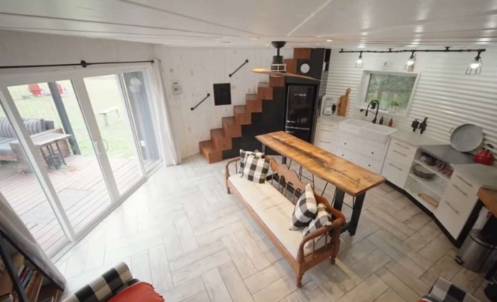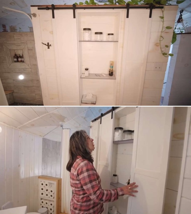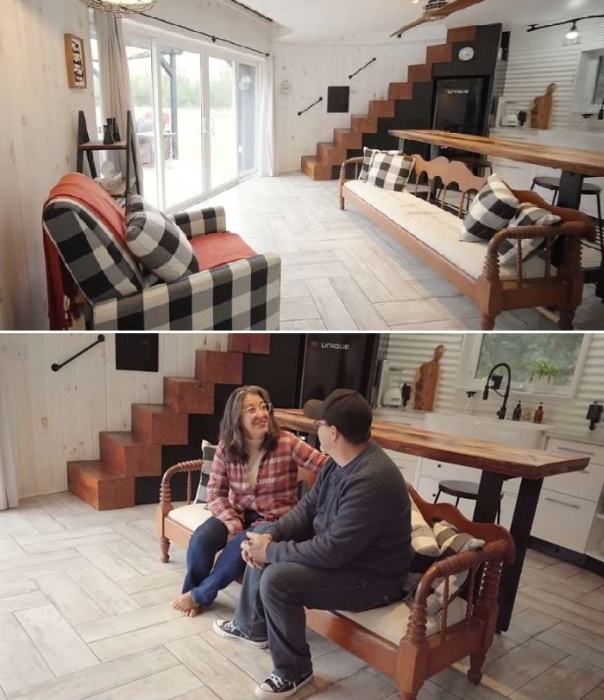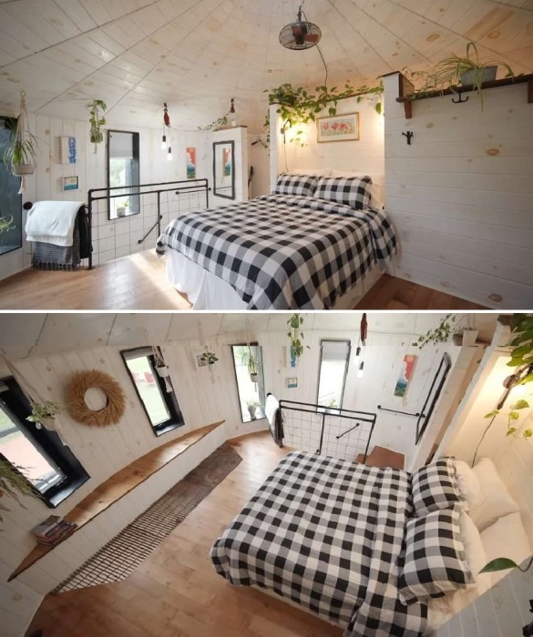 Не менее интересным стало оформление второго уровня, где центральное место занимает просторная спальня. Большая двуспальная кровать окружена несколькими окнами, открывающими виды на живописную округу, поскольку отчаянные супруги уже давно живут в природной зоне. Зная толк в обустройстве крошечных пространств и, понимая, как важна правильно организованная система вентиляции, они предусмотрели решетчатый пол в одной части структуры, что позволяет устраивать как перекрестное проветривание, так и экономить на отоплении.